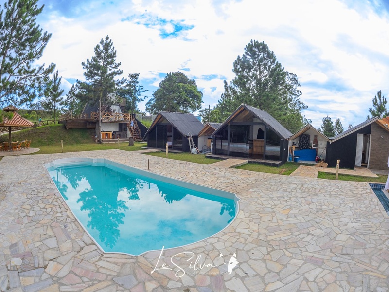 Chalés aconchegantes em meio à natureza, com piscinas e áreas de lazer compartilhadas para momentos de descanso e tranquilidade.