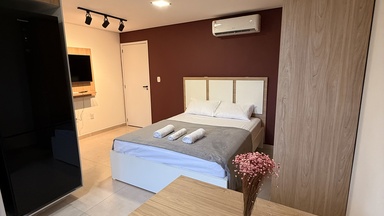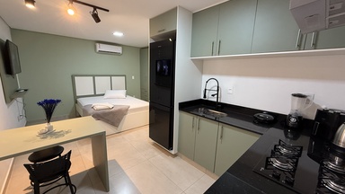 Cada flat foi pensado para oferecer aconchego e funcionalidade, com ambientes bem iluminados, decoração elegante, cozinha equipada, Wi-Fi, ar-condicionado e tudo o que você precisa para se sentir em casa.