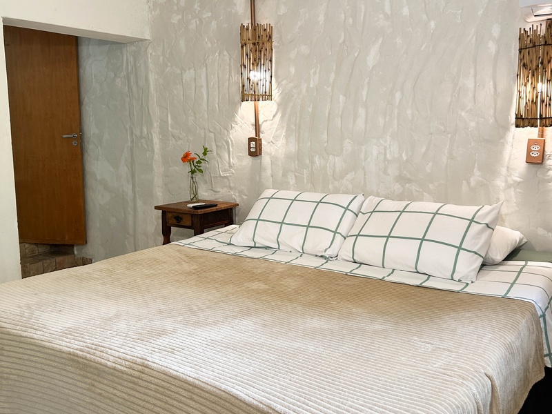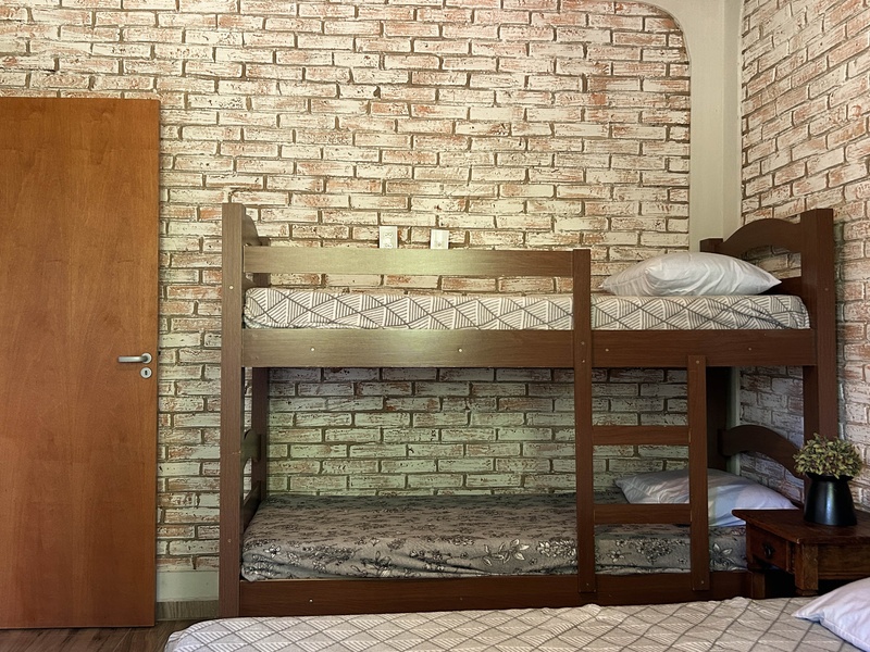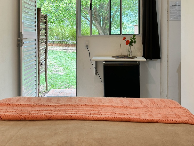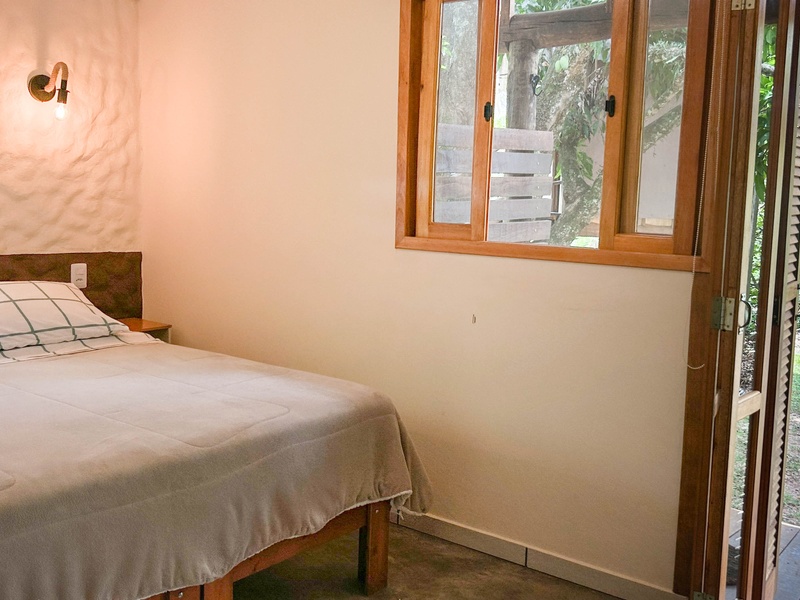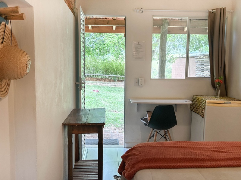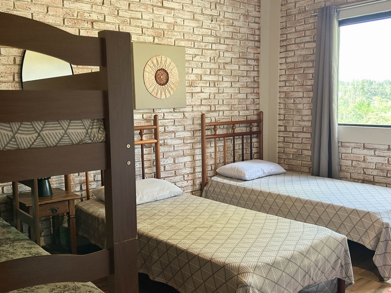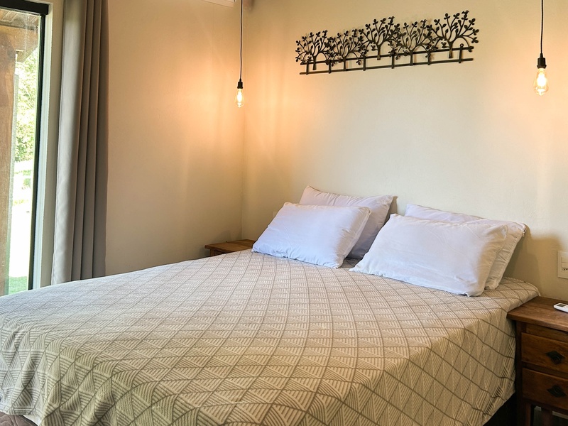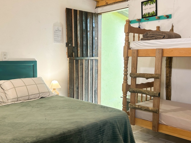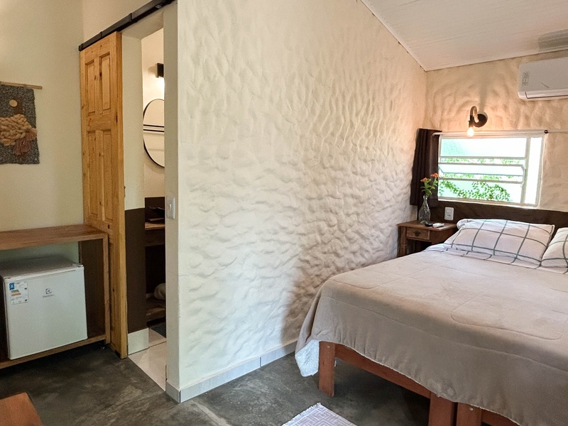 Nossa única suíte que pode receber famílias, conta com uma cama beliche extra, além da cama de casal. Com acesso a espaços comum com cozinha, piscina climatizada, trilha, restaurante e área de lazer.