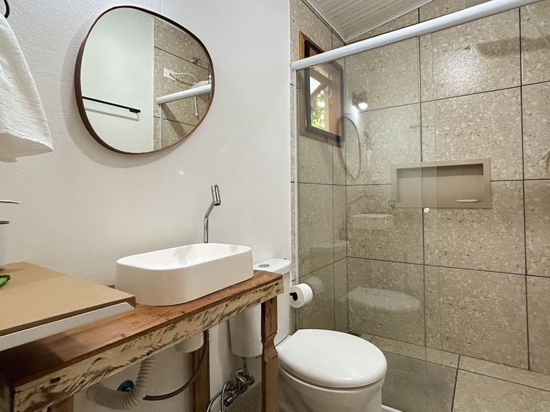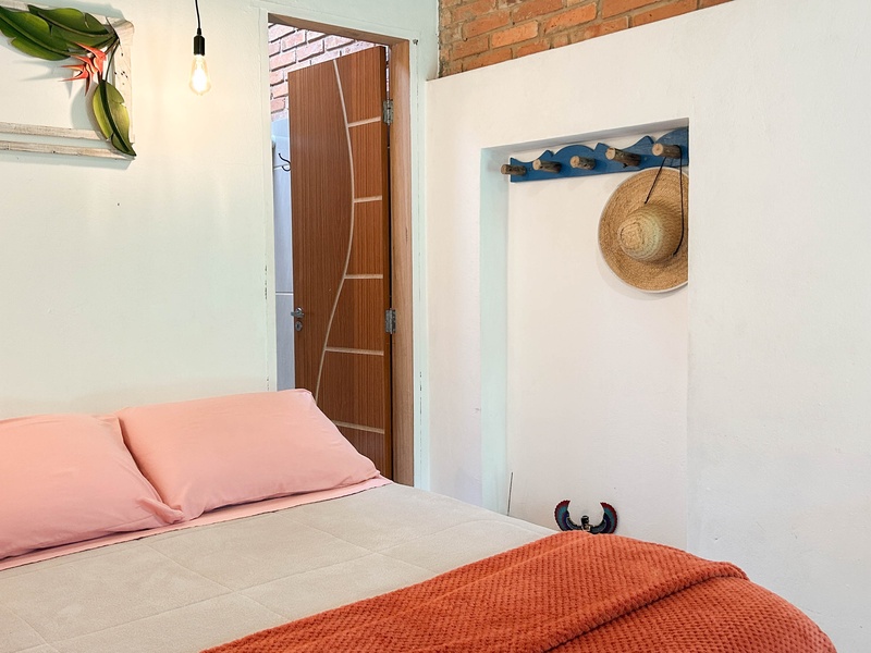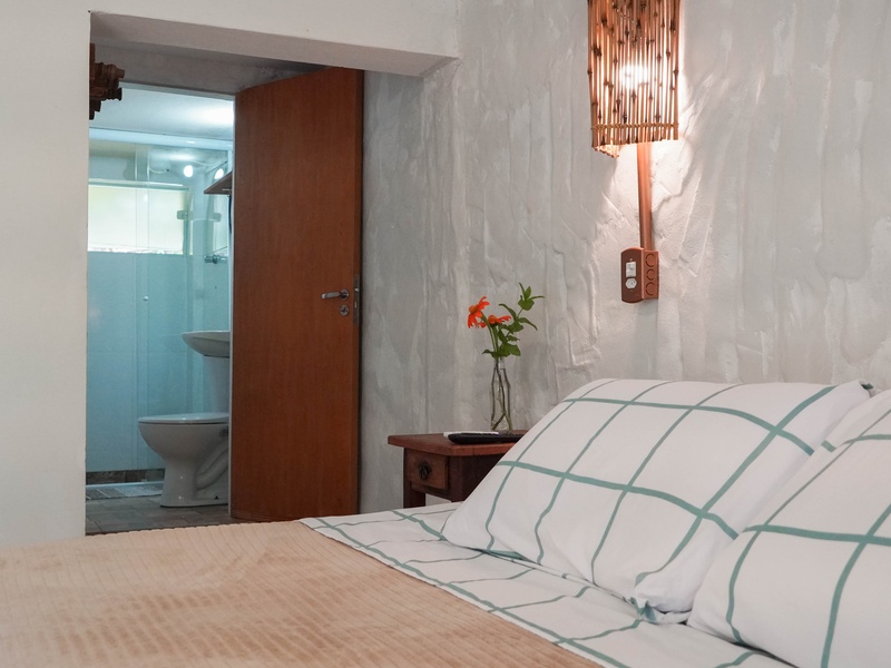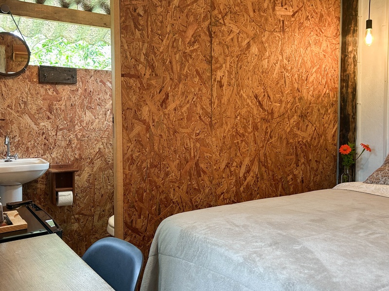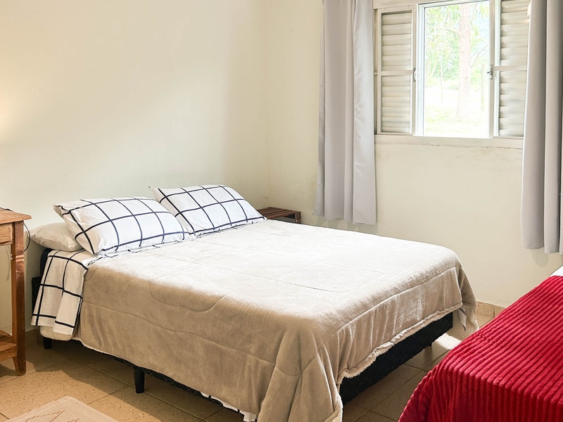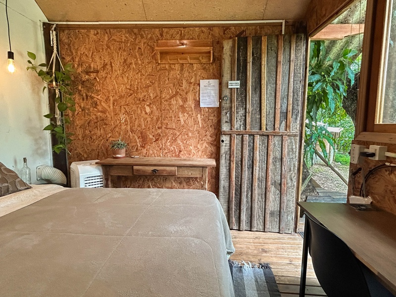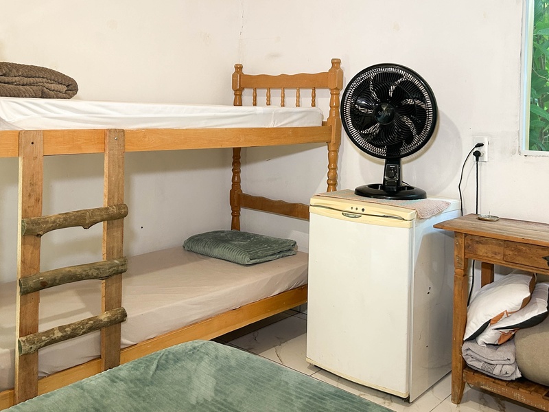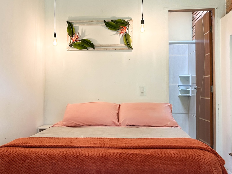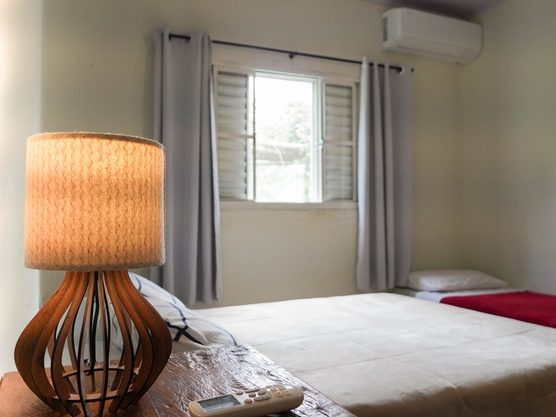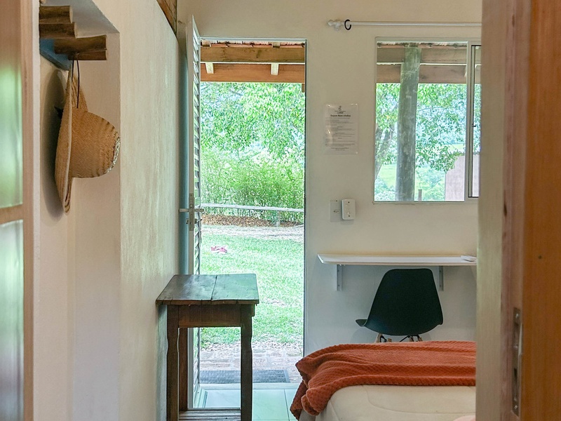Nossa única suíte que pode receber famílias, conta com uma cama beliche extra, além da cama de casal. Com acesso a espaços comum com cozinha, piscina climatizada, trilha, restaurante e área de lazer.