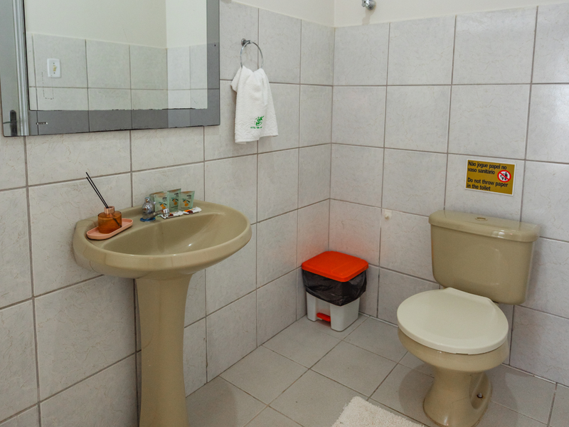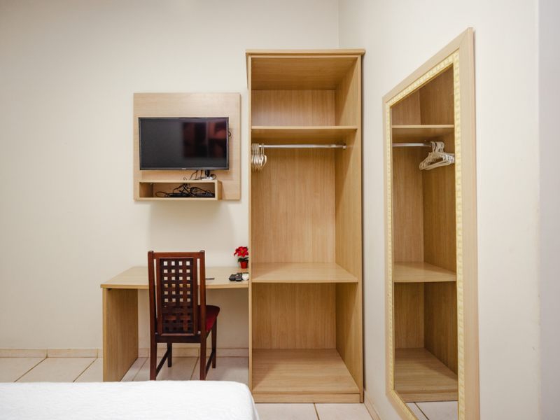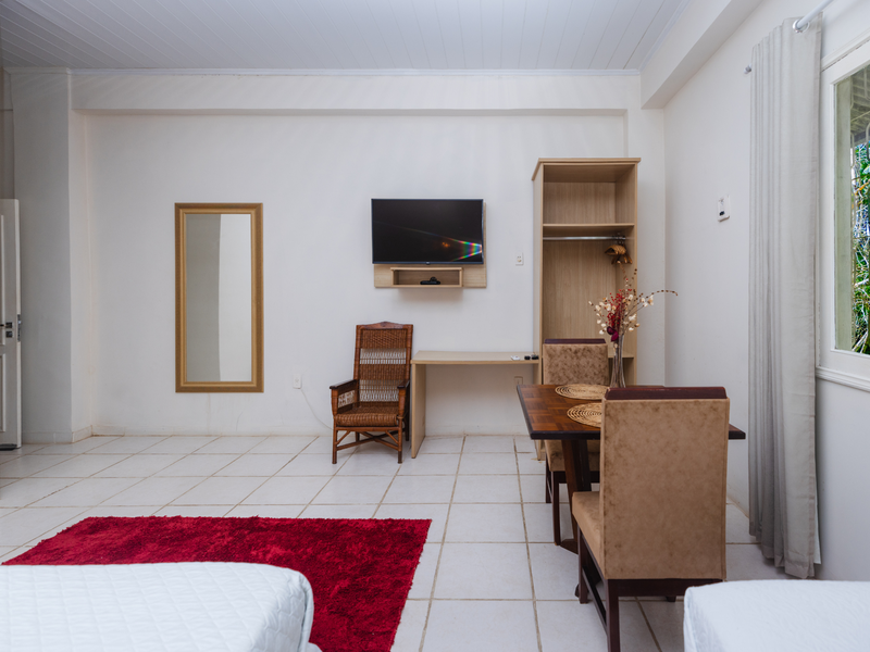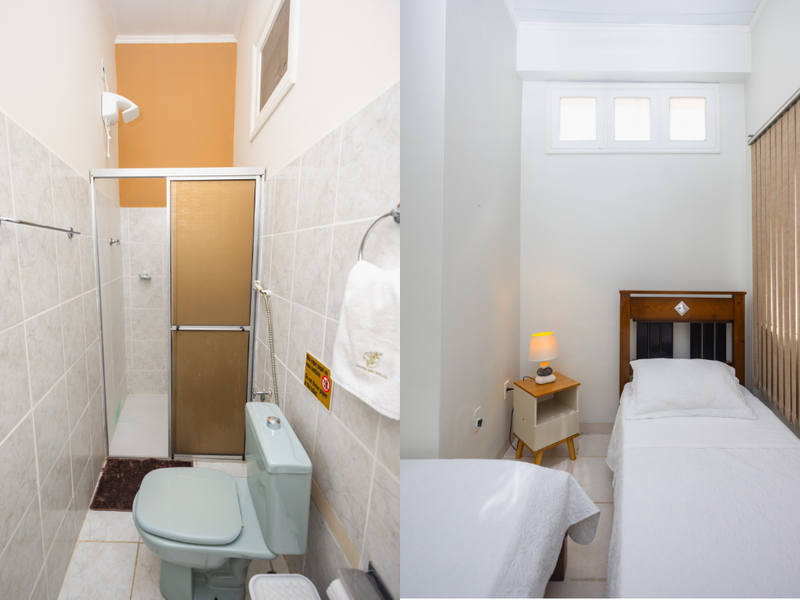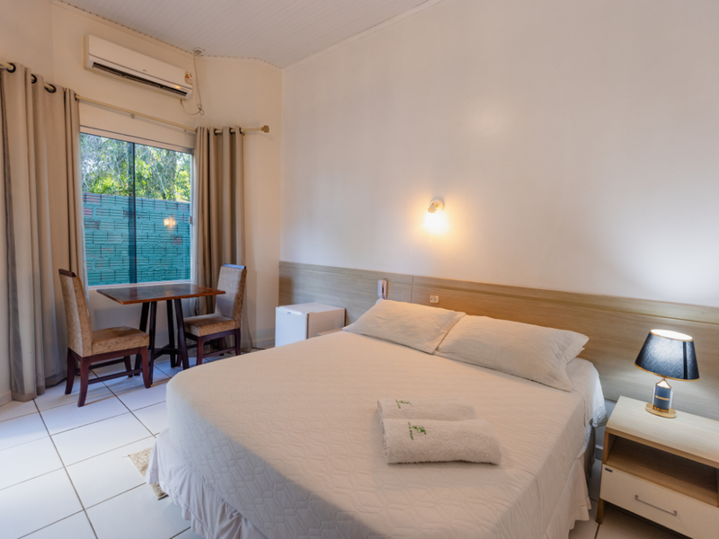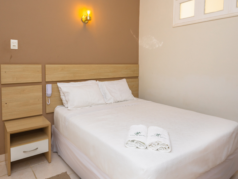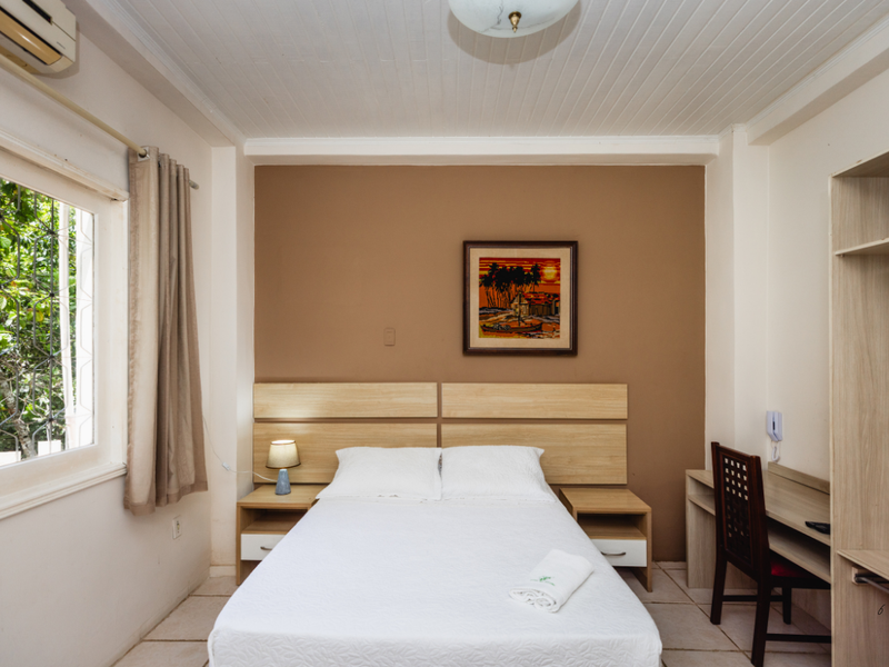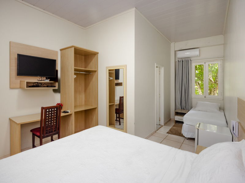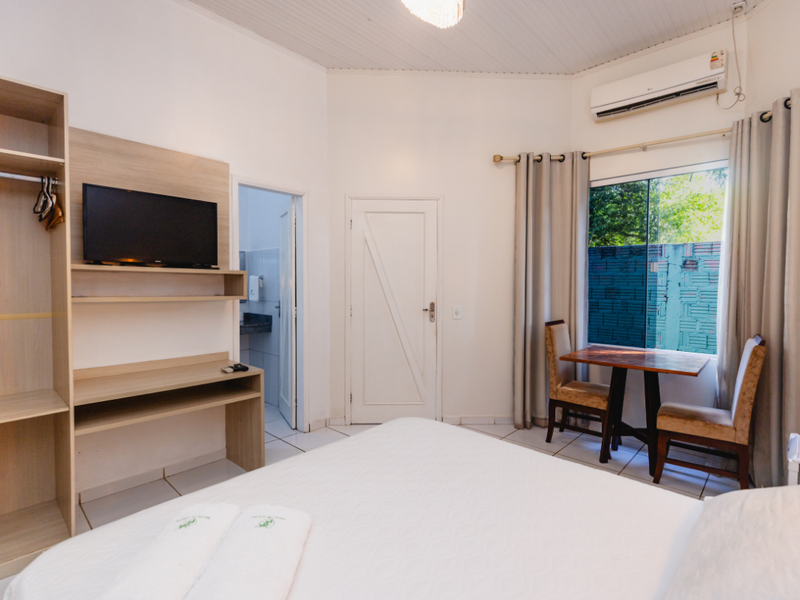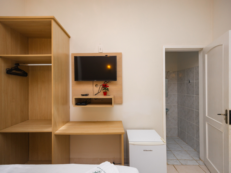 A Suíte Solteiro dispõe de cama confortável, ar-condicionado, Wi-Fi, TV, mesa de apoio, guarda-roupa e banheiro privativo com amenities.
