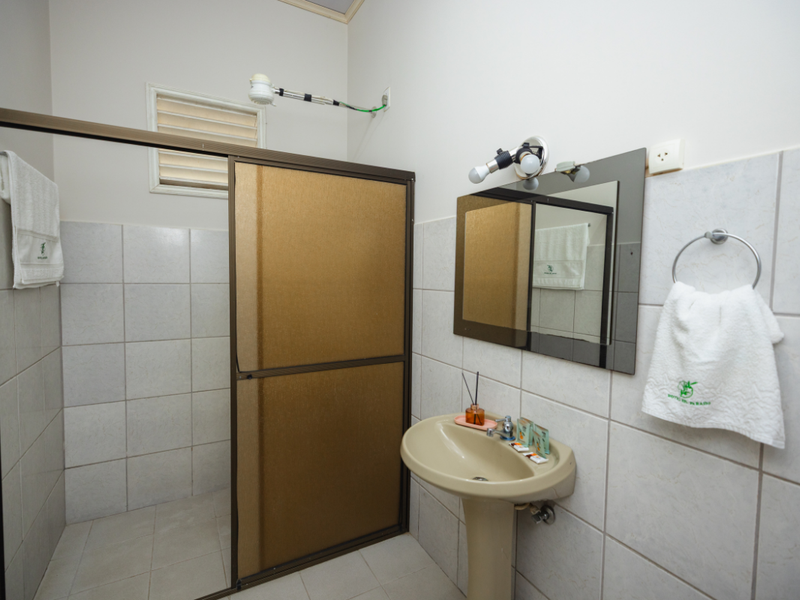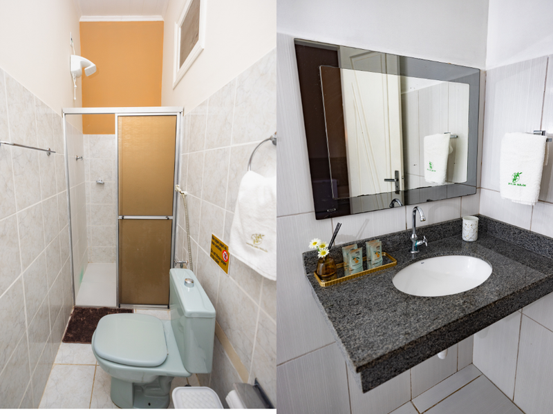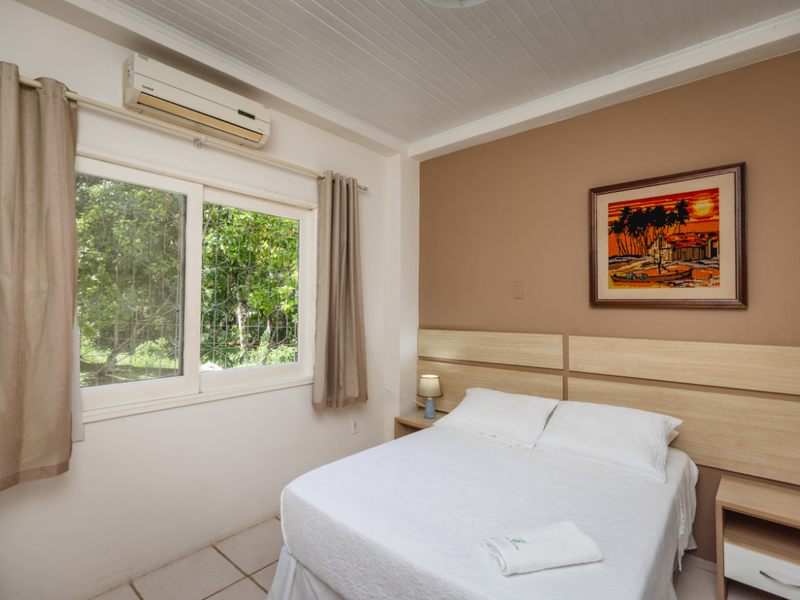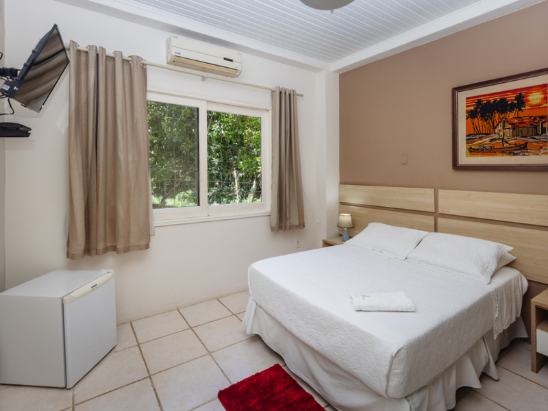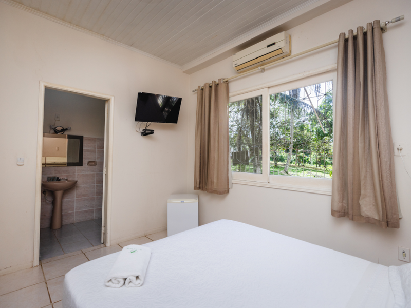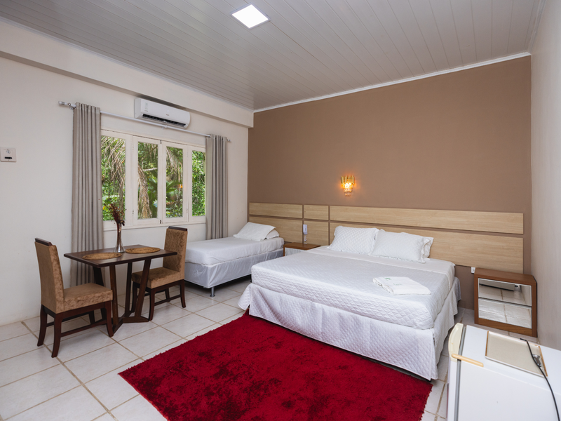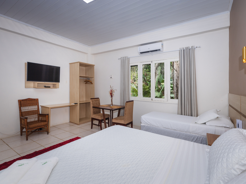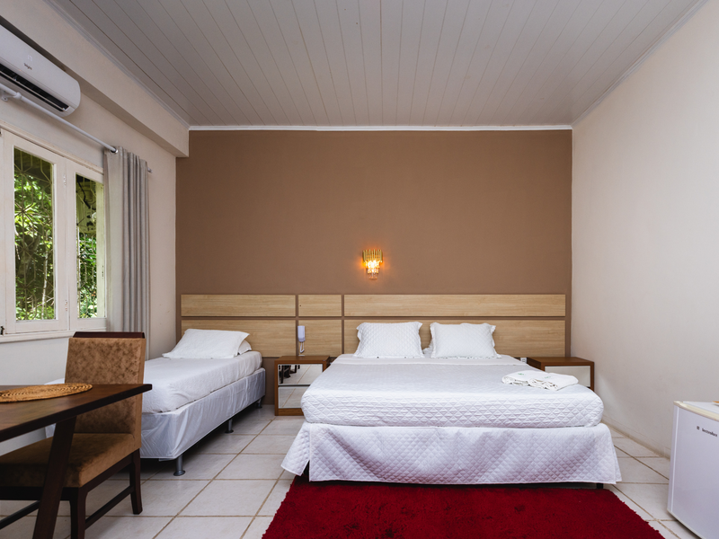 Quarto amplo e aconchegante, com 1 cama de Casal Super King e 1 cama de solteiro, ar-condicionado, TV, frigobar, mesa de apoio e armário. Possui banheiro privativo com box de vidro e vista para a natureza, proporcionando tranquilidade e bem-estar durante a estadia.