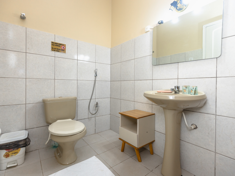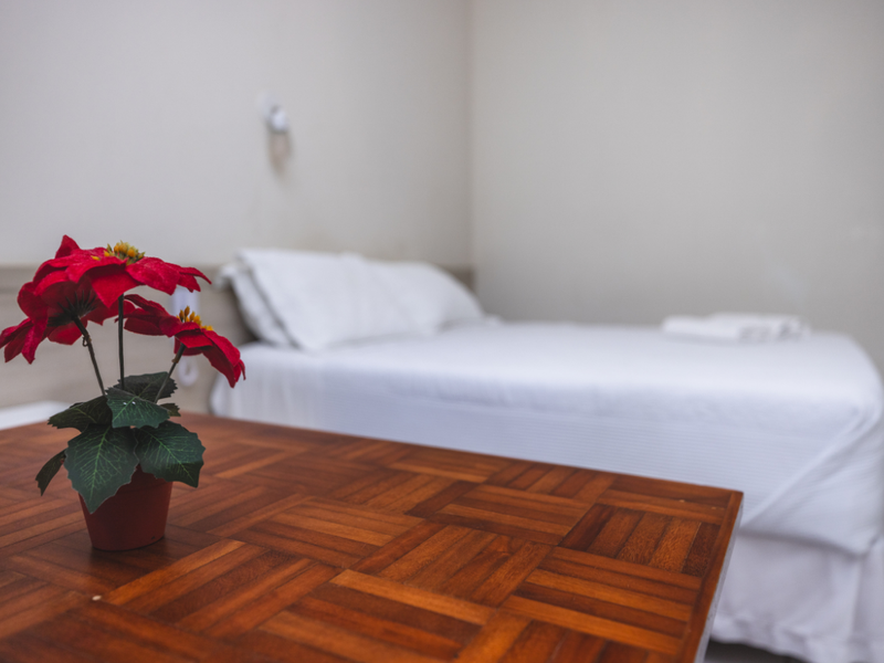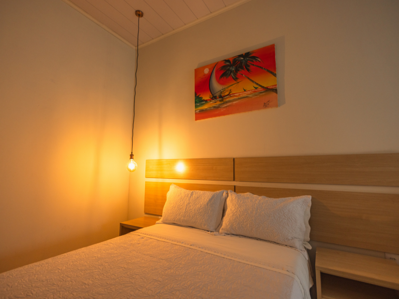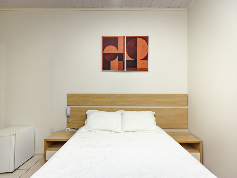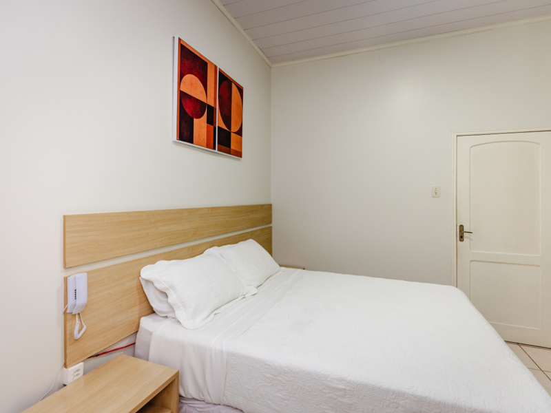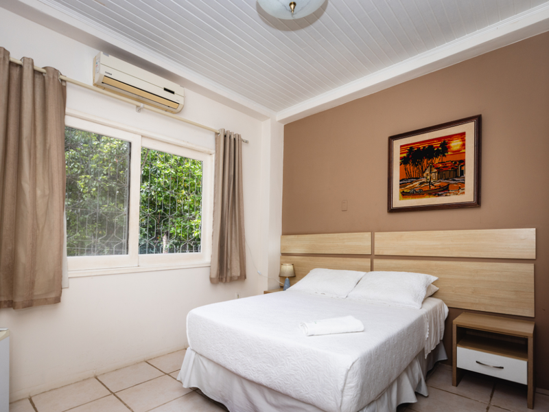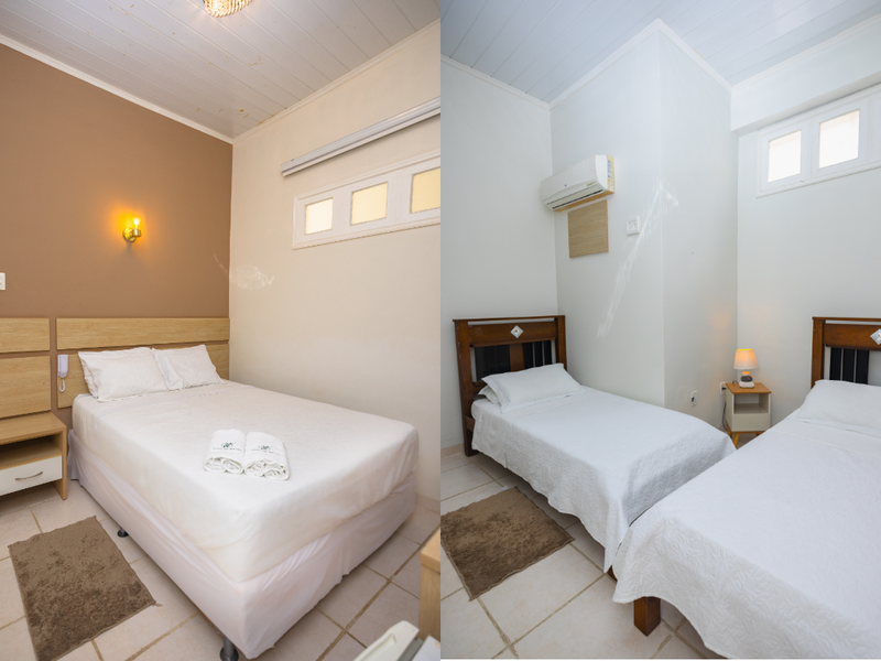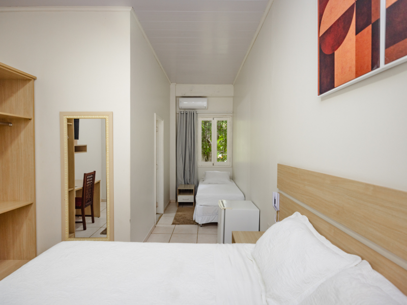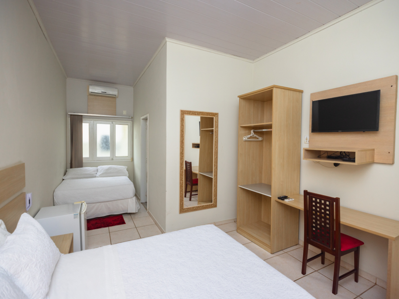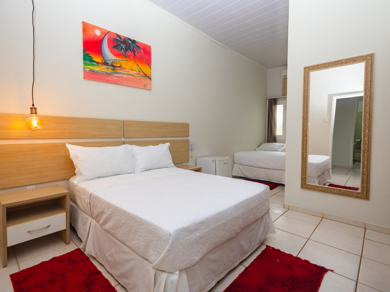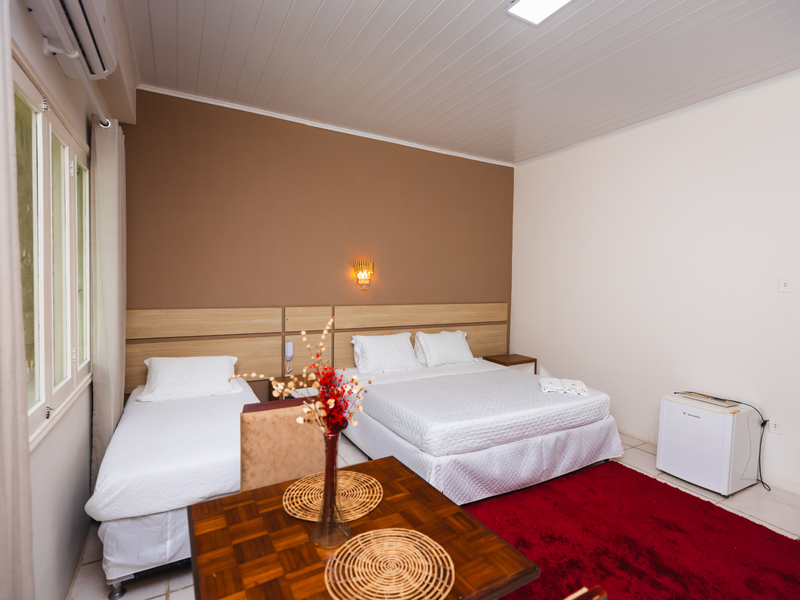 Quarto confortável que acomoda até 3 pessoas. Possui cama de casal e cama de solteiro, ar-condicionado, Wi-Fi, TV, frigobar, espaço para roupas e banheiro privativo. Ideal para famílias pequenas ou grupos que buscam conforto e praticidade.