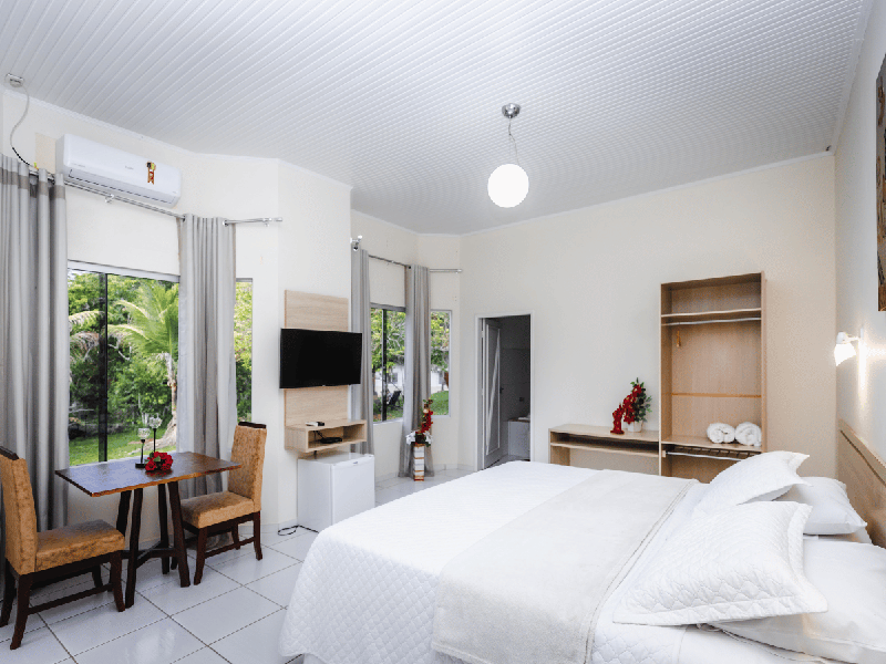 Ambiente confortável e aconchegante para dois. A Suíte Casal conta com cama de casal, ar-condicionado, Wi-Fi, TV, frigobar, mesa com cadeiras, espaço para roupas e banheiro privativo. Ideal para quem busca descanso e momentos tranquilos no Hotel Spa Paraíso.