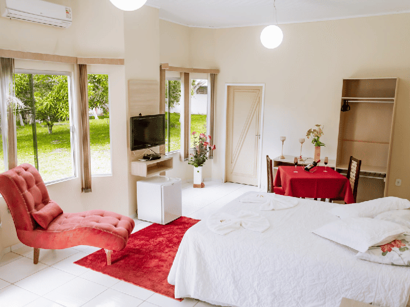 Refúgio de conforto e bem-estar em meio à natureza. Suítes Standard, Executiva e Master, com opção de banheira de hidromassagem. Café da manhã servido no quarto e spa completo