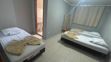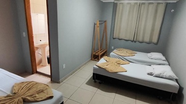 Quarto versátil com ar-condicionado, TV e 3 acomodações (1 cama de casal + 1 de solteiro). Banheiro privativo com chuveiro quente e Wi-Fi liberado.