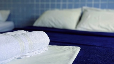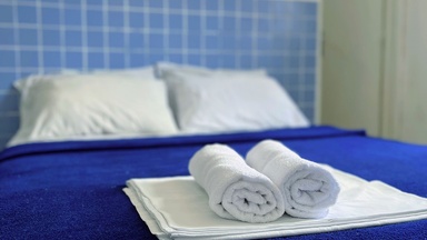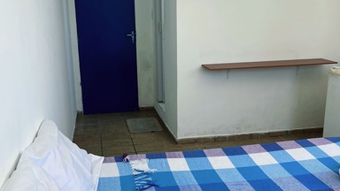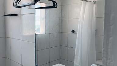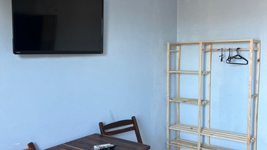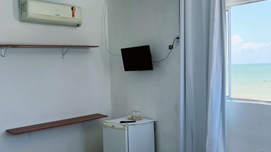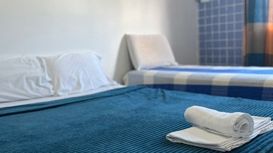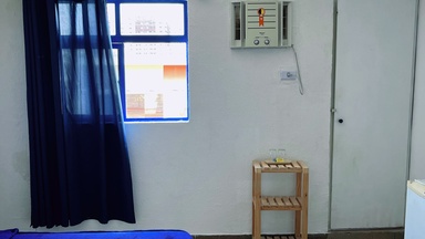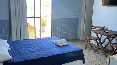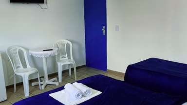 Quarto amplo, com banheiro privativo, uma cama de casal, uma cama de solteiro, e bicama (a pedido), ar-condicionado, TV, frigobar, Wi-Fi e roupeiro. Inclui café da manhã.
