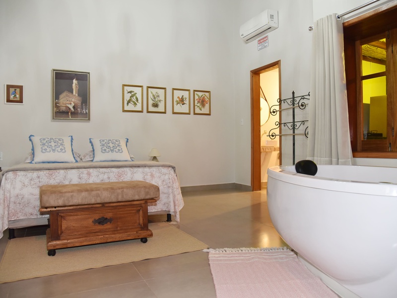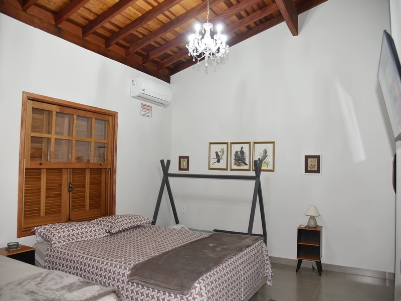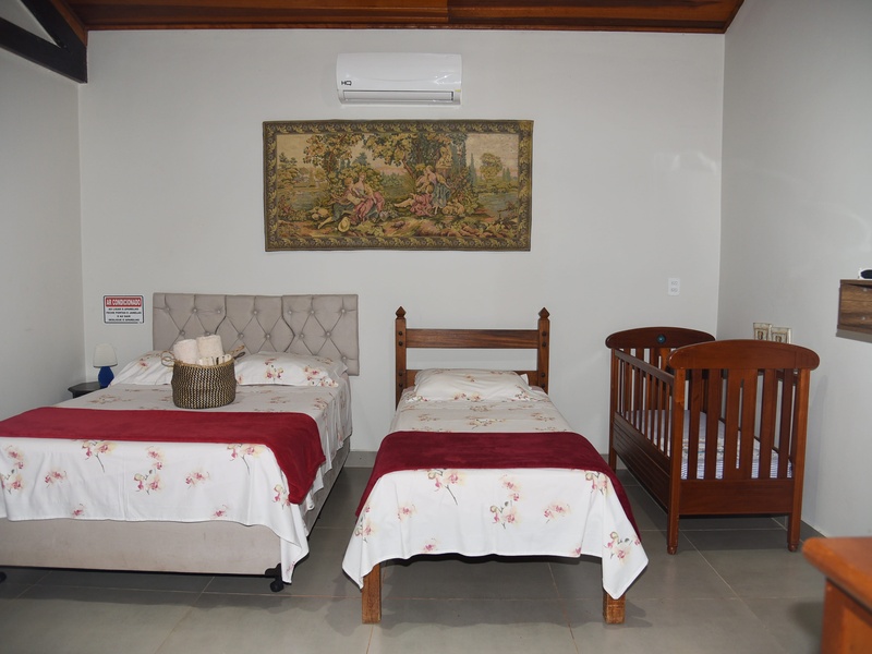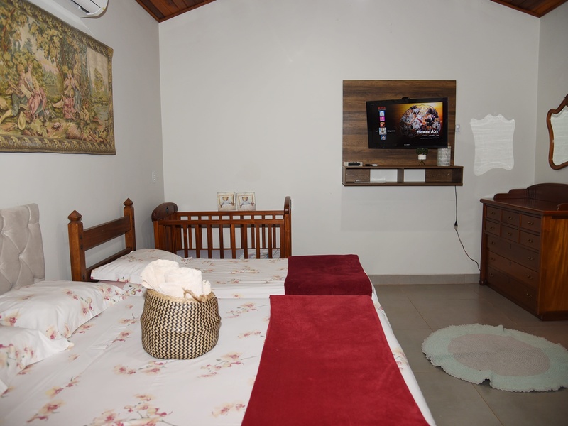A Suíte 6 pé direito duplo, possui 1 cama Queen e 1 cama de solteiro e 1 cama Montesoriana, berço, Smart Tv e ar-condicionado e cozinha compartilhada. Preço diária com café da manhã! Check in 14h / Check out 12h