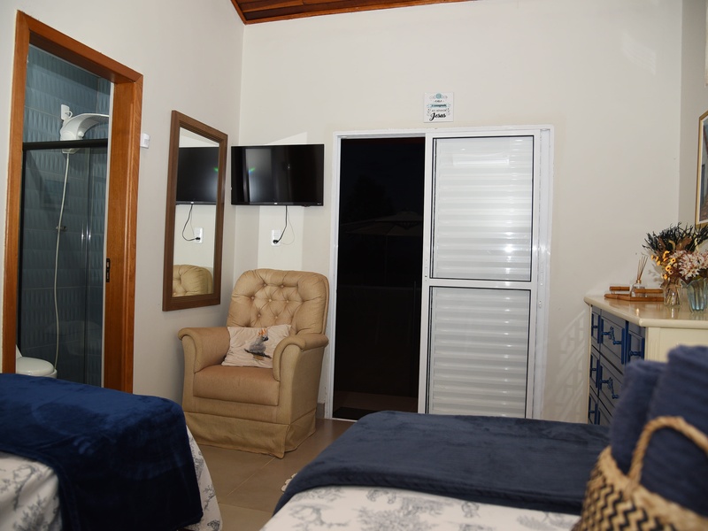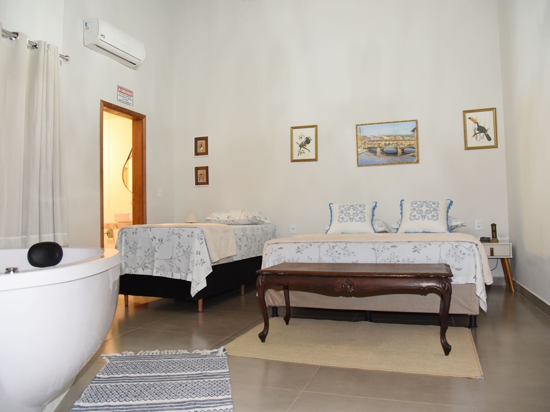 A Suíte 1 possui 1 cama de casal e 1 de solteiro, Smart Tv e ar-condicionado e cozinha compartilhada. Preço diária com café da manhã! Check in 14h / Check out 12h