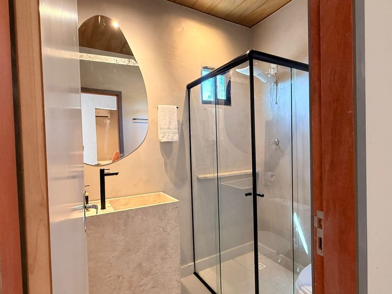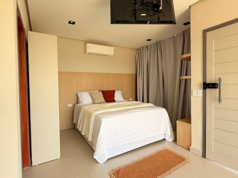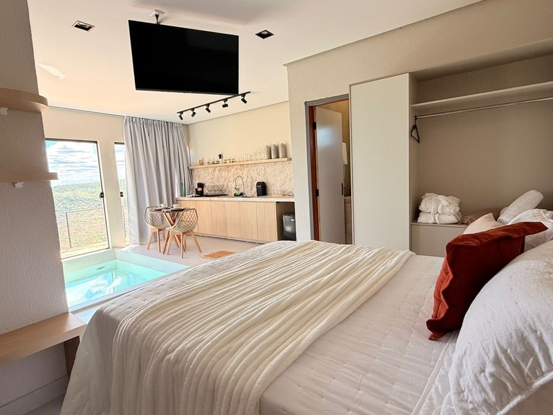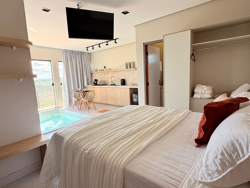 Suíte com cama queen, ar-condicionado, cozinha completa, piscina privativa, deck com mirante, churrasqueira e vista para a serra.