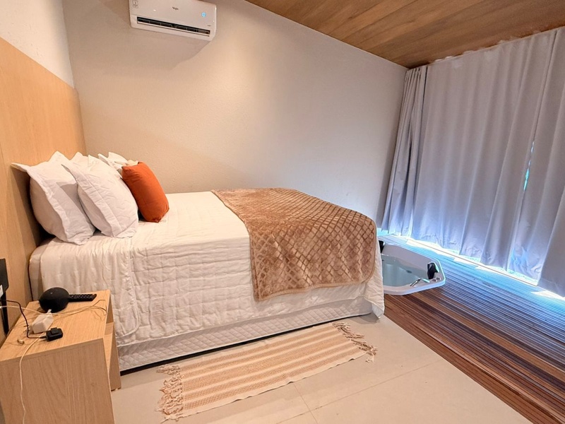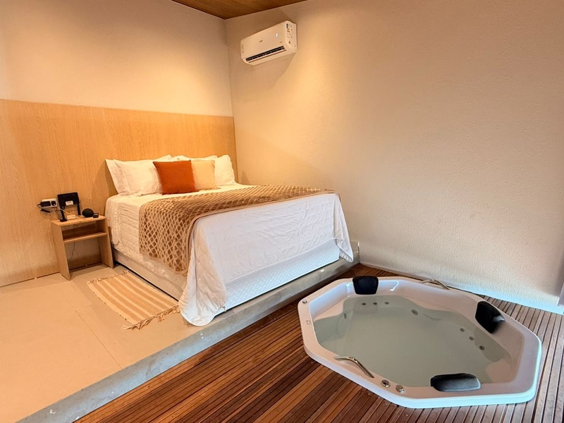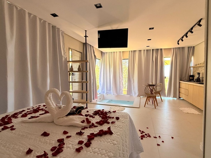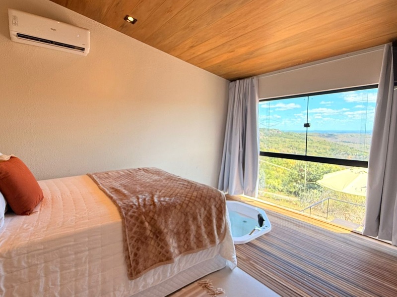 Suíte com cama queen, ar-condicionado, cozinha completa, banheira com hidromassagem, churrasqueira e deck com vista para a serra.
