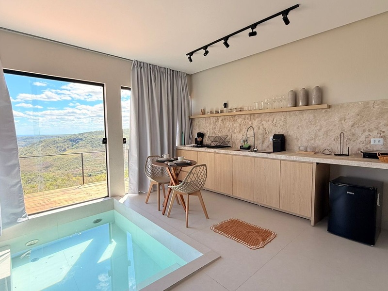 Suíte com cama de casal, ar-condicionado, cozinha completa, piscina privativa, deck com mirante, churrasqueira e vista para a serra.