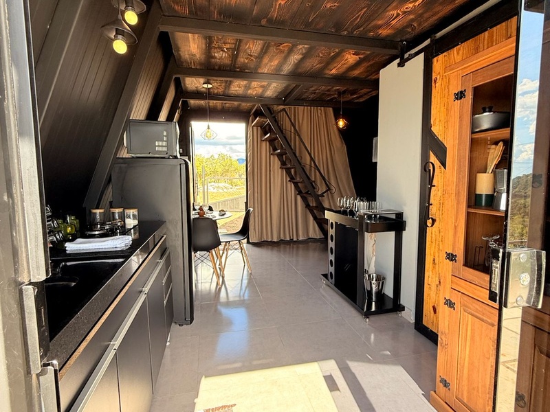 Suíte com cama queen, ar-condicionado, cozinha completa, banheira com hidromassagem, aquecedor, deck com mirante, fogo de chão e vista para a serra.