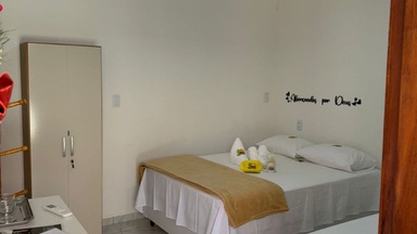 Quartos Triplo. 01 Cama de Casal, 01 Cama de Solteiro, Frigobar, Ar-condicionado, Guarda roupa, Chuveiro elétrico e Varanda.