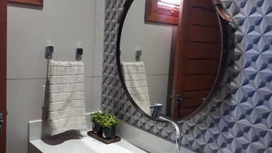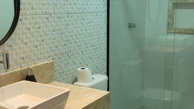 Suíte confortável e aconchegante, ideal para casais, com cama de casal, TV, frigobar e banheiro privativo com chuveiro elétrico. Possui arquitetura moderna e varanda com espaço para armar redes na …