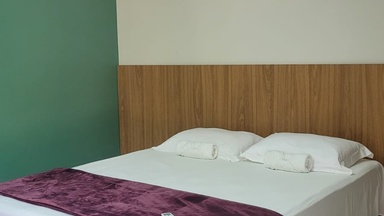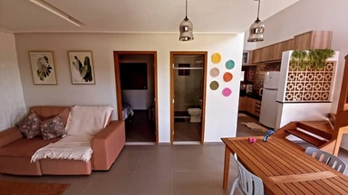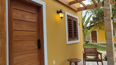 Suíte confortável que acomoda casal, com possibilidade de incluir uma cama extra, conforme disponibilidade. Possui TV, frigobar, banheiro privativo com chuveiro elétrico. Não permite armar rede na área externa.