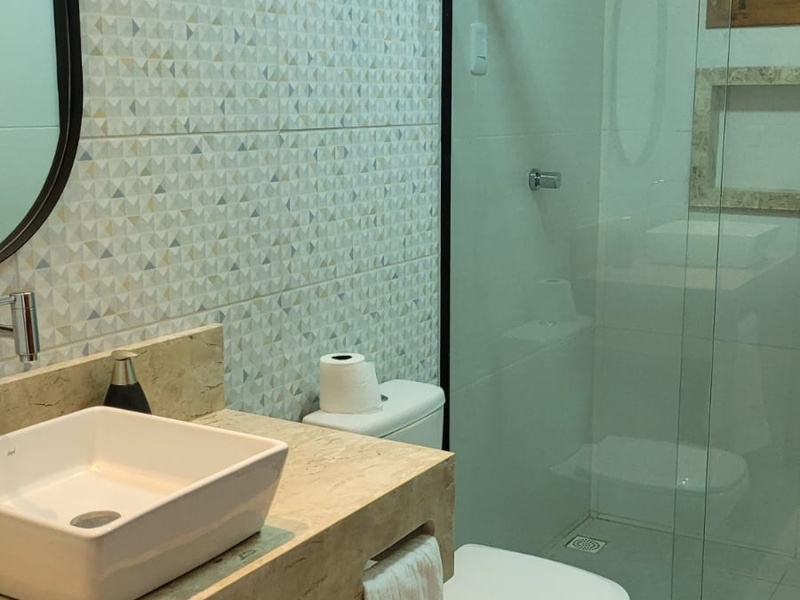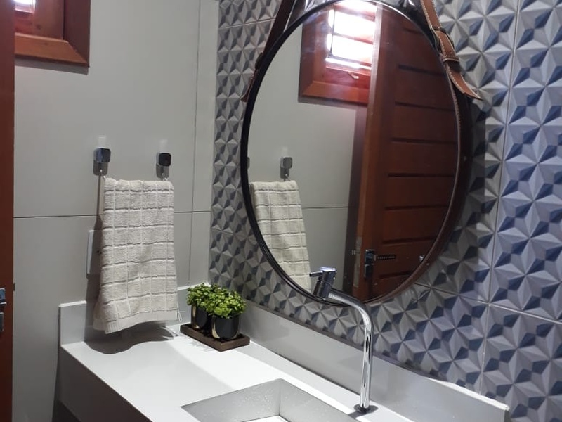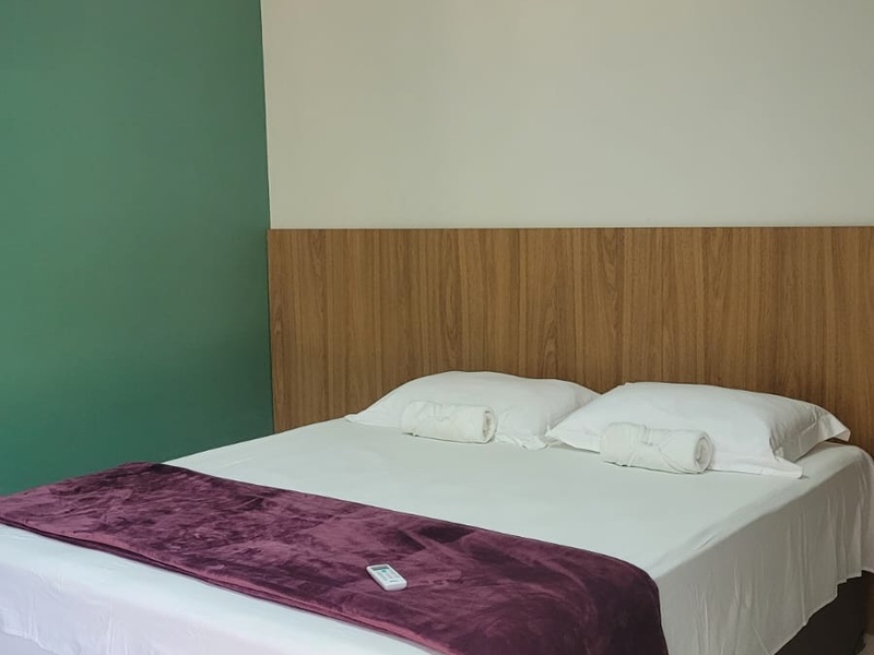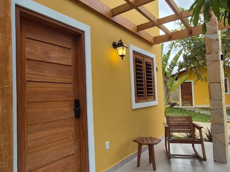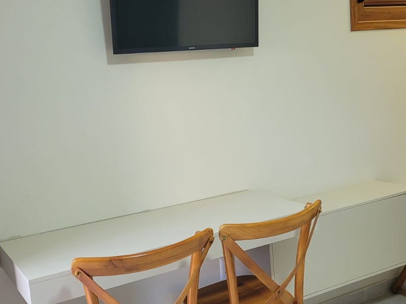 Suíte confortável e aconchegante, ideal para casais, com cama de casal, TV, frigobar e banheiro privativo com chuveiro elétrico. Possui arquitetura moderna e varanda com espaço para armar redes na área externa. Possibilidade de cama extra, conforme disponibilidade.