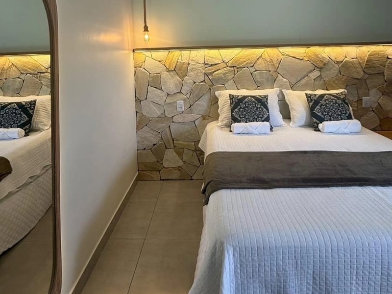 Suíte Família – Vivendas da Serra Suíte ampla e confortável, com 1 cama de casal e opção de acrescentar outra cama de casal ou 2 camas de solteiro. Possui ar-condicionado, frigobar e banheiro privativo com chuveiro elétrico. Área externa com terraço para armar redes. Ideal para famílias ou pequenos grupos.