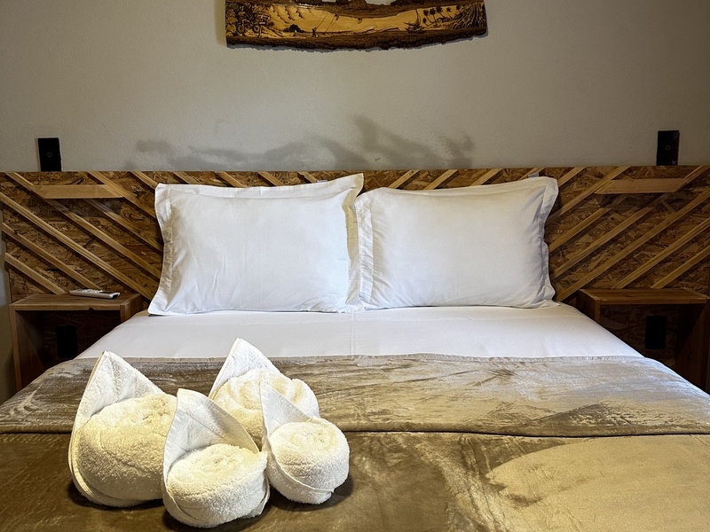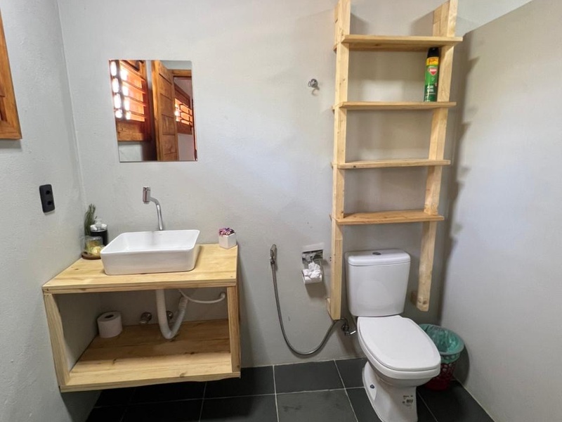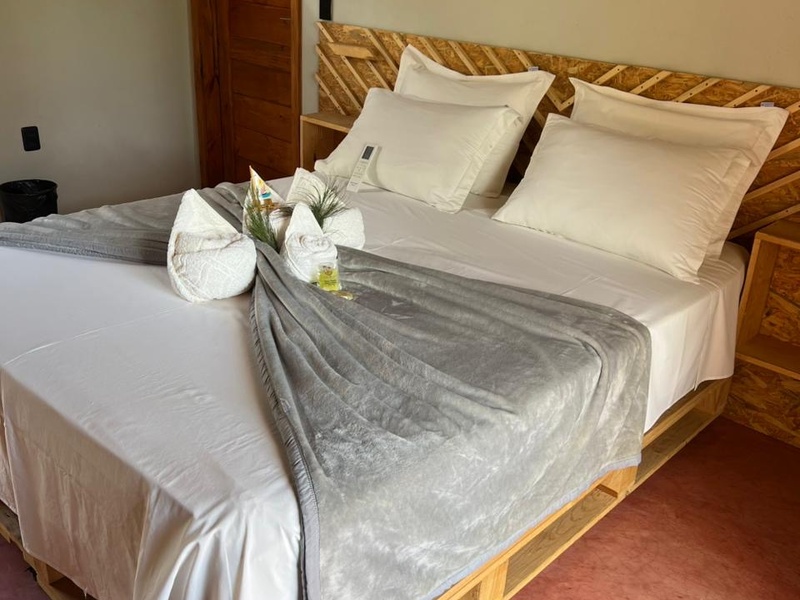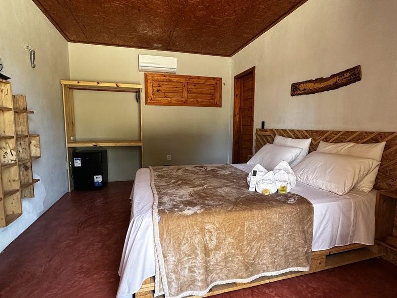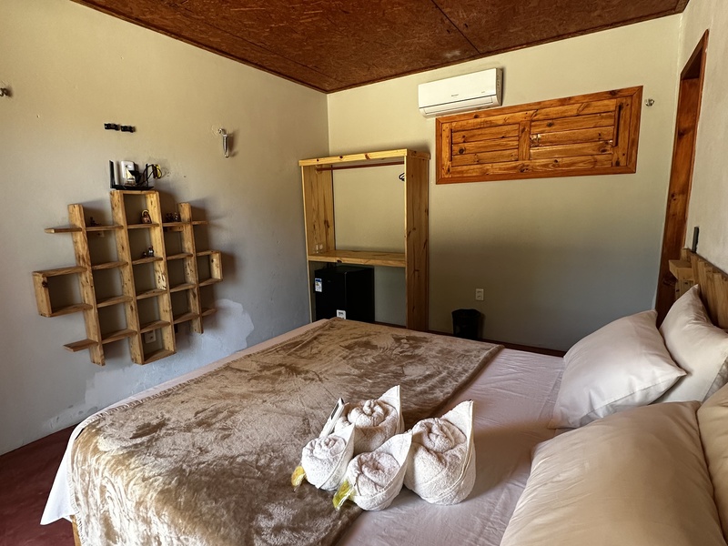 Suítes pavimento superior equipadas com ar condicionado, frigobar de 90l, cama queen e chuveiro quente