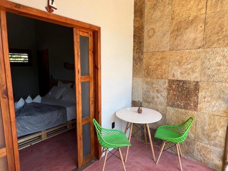 Suite Jardim, pavimento térreo, equipada com ar condicionado, frigobar 70l, cama queen-size e chuveiro quente. Possível adicionar até duas redes para acomodação de crianças.