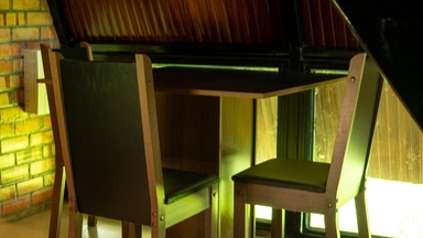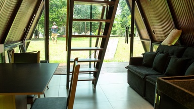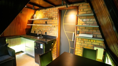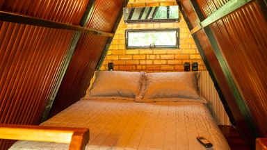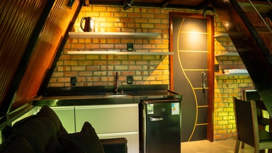 Chalés com design diferenciados e aconchegantes. No mezanino, há uma cama de casal, enquanto o térreo conta com um sofá, que, pode ser substituído por uma cama de solteiro, conforme …